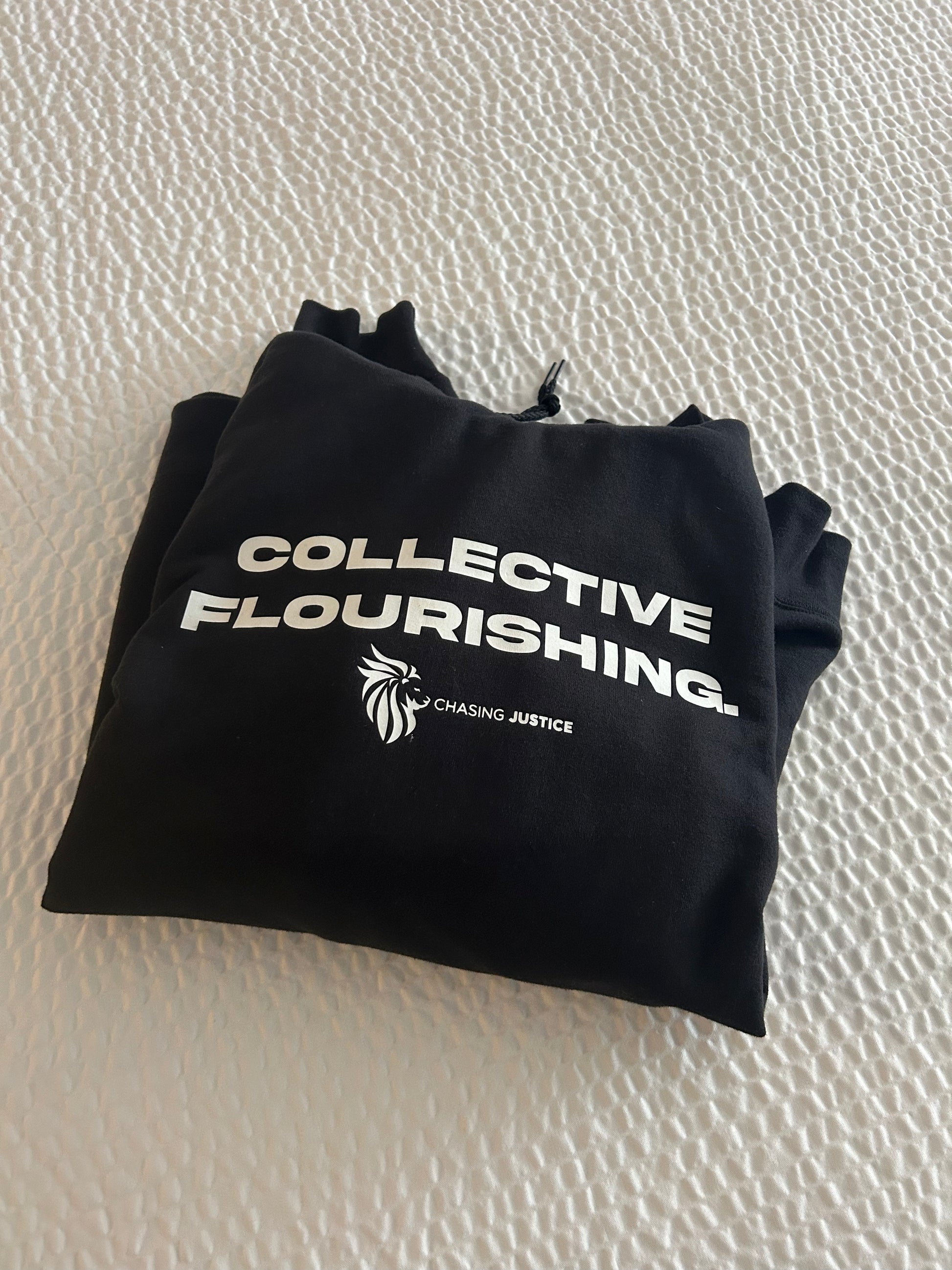 This black, heavy-cotton hoodie embodies and supports a vision where everyone thrives. With front pockets for everyday comfort, it wraps you in the hope of collective flourishing rooted in faith and solidarity. And when you wear it, you’re not just staying warm: 10% of every purchase supports The Shepherd’s Society and their work with families in Palestine. Comes with a free Collective Flourishing sticker from our collection. Justice looks good on all of us.